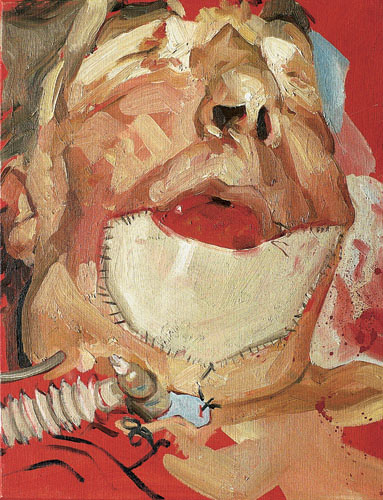 She underwent resection of the front of her lower jaw and chin and the lymph glands in her neck (radical neck dissection). After this her reconstruction was simplified to ensure a shorter operation. Her remaining jaw was held in position with a strong titanium metal plate bent to the correct shape and the skin of her chin was reconstructed with muscle and skin from her chest wall (pectoralis major myocutaneous pedicled flap based on the pectoral artery and vein from the acromiothoracic vessels). The operation took a total of 6 hours and Edith made a miraculous recovery. She lived for a further 2 years without the cancer returning and was able to eat and speak relatively well before dying peacefully at home. This painting shows her immediately at completion of the operation.
